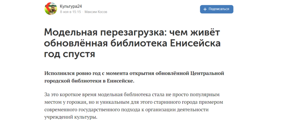 Модельная перезагрузка: чем живёт обновлённая библиотека Енисейска год спустя. Ссылка здесь: https://m.vk.com/@kultura_24-modelnaya-perezagruzka-chem-zhivet-obnovlennaya-biblioteka-e