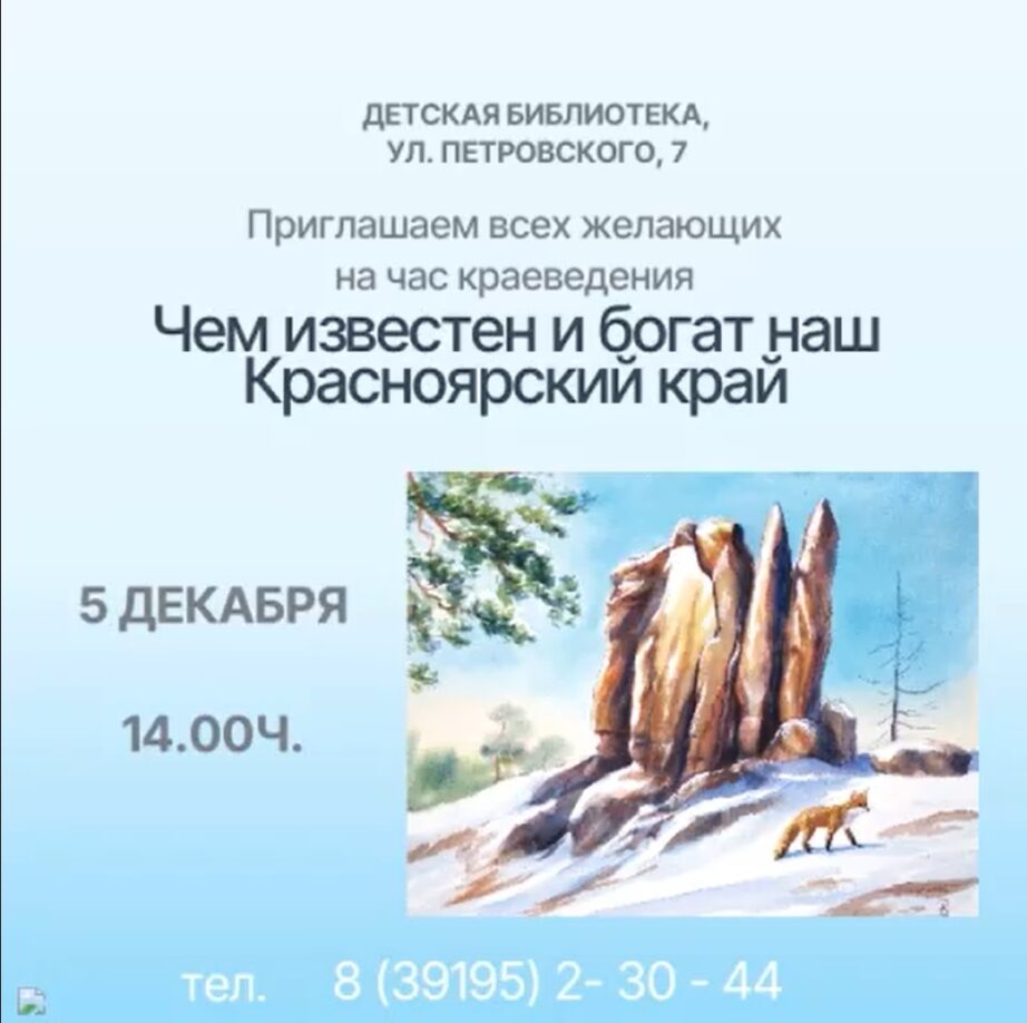 3 декабря в городской библиотеке прошло мероприятие в рамках 90-летнего юбилея Красноярского края. Учащиеся 8 класса школы № 7 познакомились с литературой по краеведению, посмотрели презентацию «Достижения Красноярского края» и приняли активное участие в игре «Код Сибири». Ребята дружно отвечали на вопросы, связанные с историей своего края, с достопримечательностями, флорой и фауной, а также вспомнили имена…