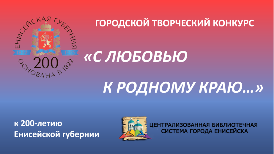 ПОЛОЖЕНИЕ о городском творческом конкурсе «С любовью к родному краю…» Общие положения Настоящее положение определяет цели и задачи, регламентирует порядок организации и проведения городского творческого конкурса «С любовью к родному краю…» (далее Конкурс). Конкурс проводится в рамках празднования 200–летия Енисейской губернии. Организатором конкурса является МБУК «ЦБС» г. Енисейска. Информационное сопровождение конкурса осуществляется на: –…