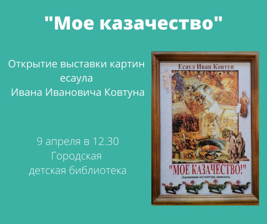 9 апреля в читальном зале городской детской библиотеки открылась выставка «Мое казачество» художника, поэта, есаула Енисейского казачьего общества Иван Ивановича Ковтун. Выставка посвящена 30-летию возрождения казачества в г. Енисейске. Иван Иванович – продолжатель традиций казачества. Эта тема проходит через всю его творческую жизнь. Иван Иванович пытается передать на холсте то что чувствует. «…Я как художник…